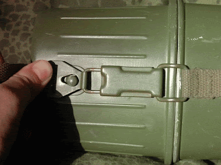 | Canteen has a mouth considerably wider than standard US canteen, closed with the NBC cap (perhaps not always, but I only have such version). As a clumsy nerd I'm often finding myself struggling with canteen caps - I rotate it, loop starts to twist and get in a way, so I have to correct it... well, not in this canteen. Neither main or NBC cap are permanently welded with a loop, and they can be freely rotated around. The loop itself can be easily moved in it's metal mounting as well. |